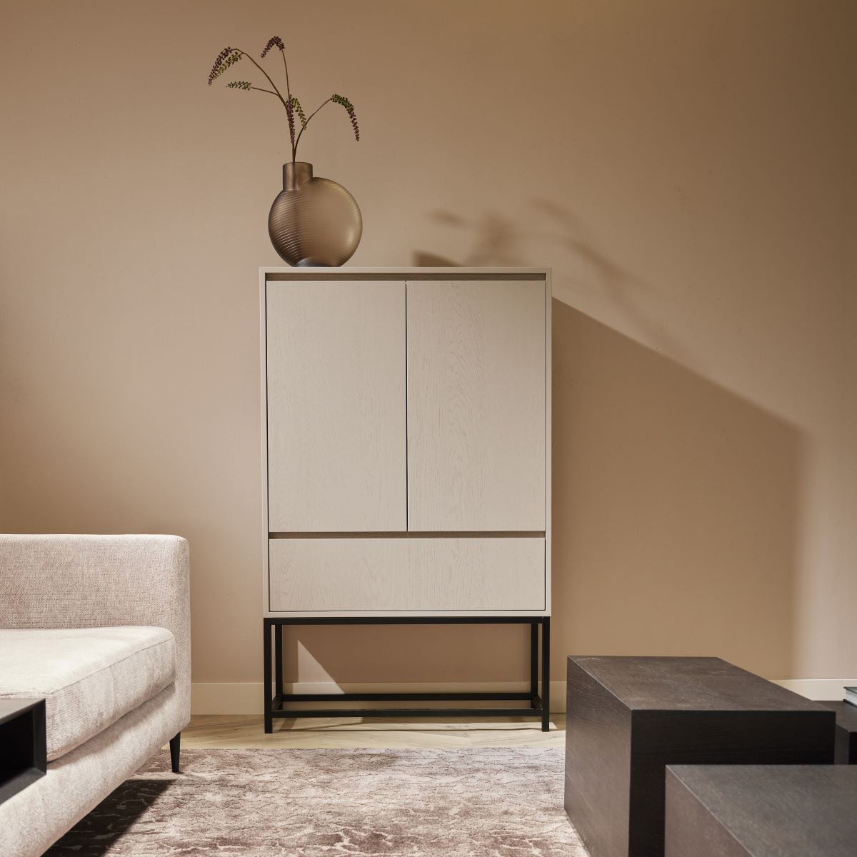 Verfijn uw woonruimte met de exclusieve IL 2083 hoge kast: een op maat gemaakt kunstwerk dat de essentie van luxe zeer goed weergeeft. Beschikbaar in een rijke variëteit aan kleuren, van NCS en RAL tot aan schitterende metallic tinten, met de keuze tussen een verleidelijk matte afwerking en de tijdloze charme van houtnerf structuren. Dit meesterwerk is vervaardigd uit hoogwaardig eiken, met een gedistingeerd corpus van zwarte melamine, staat op een gave poot van metaal en wordt met zorg geproduceerd op Hollandse bodem. Deze hoge kast is niet slechts een meubelstuk, maar een symbool van luxe maatwerk dat naadloos past in het hart van een verfijnd interieur.